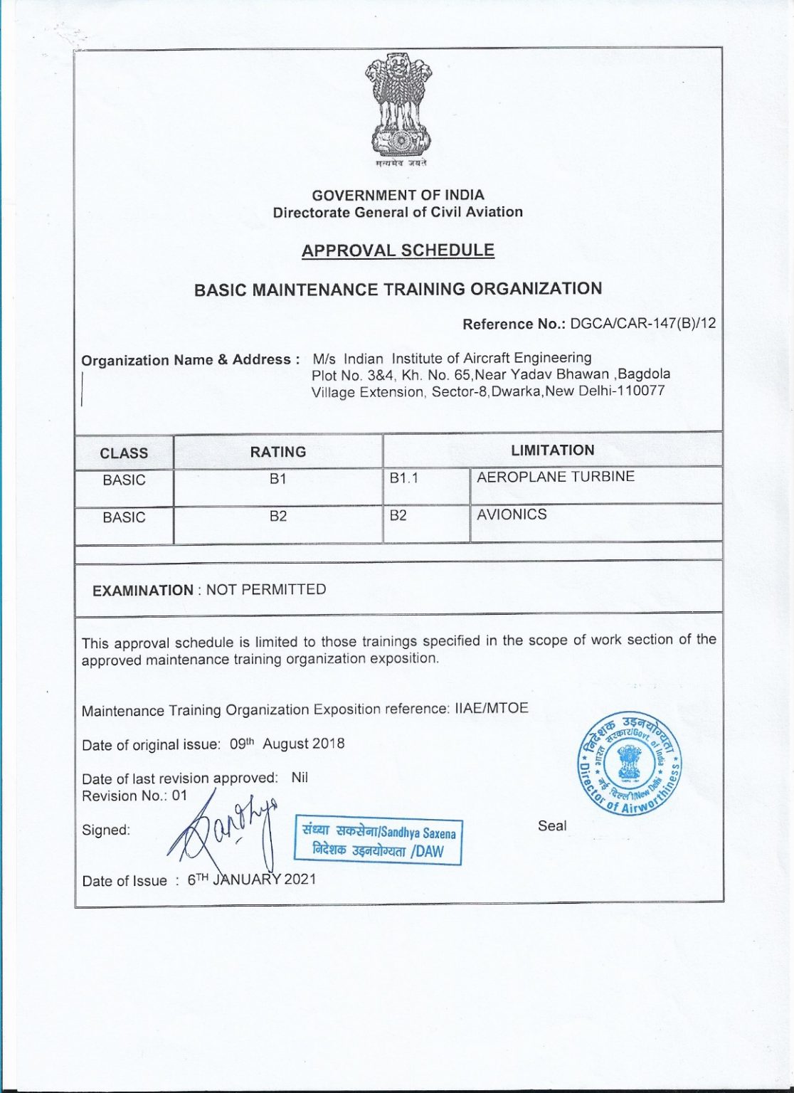 The academic programme is divided into four semesters covering 2400 hours of theoretical and practical training in 2 years duration for both B1.1 and B2 stream. Out of 2400 hours of training, 1440 hours will be devoted in classroom teaching and 960 hours will be devoted for Practical training. Out of 960 hours of practical training, i.e. 30% will be conducted in actual maintenance environment at AMO (Aircraft Maintenance Organization). For this, IIAE has entered into long term legal contract with M/S SAURYA AREONOTCS PVT.LTD., New Delhi, for all the practical training required to be imparted on flying aircraft under CAR-147(Basic) programme.